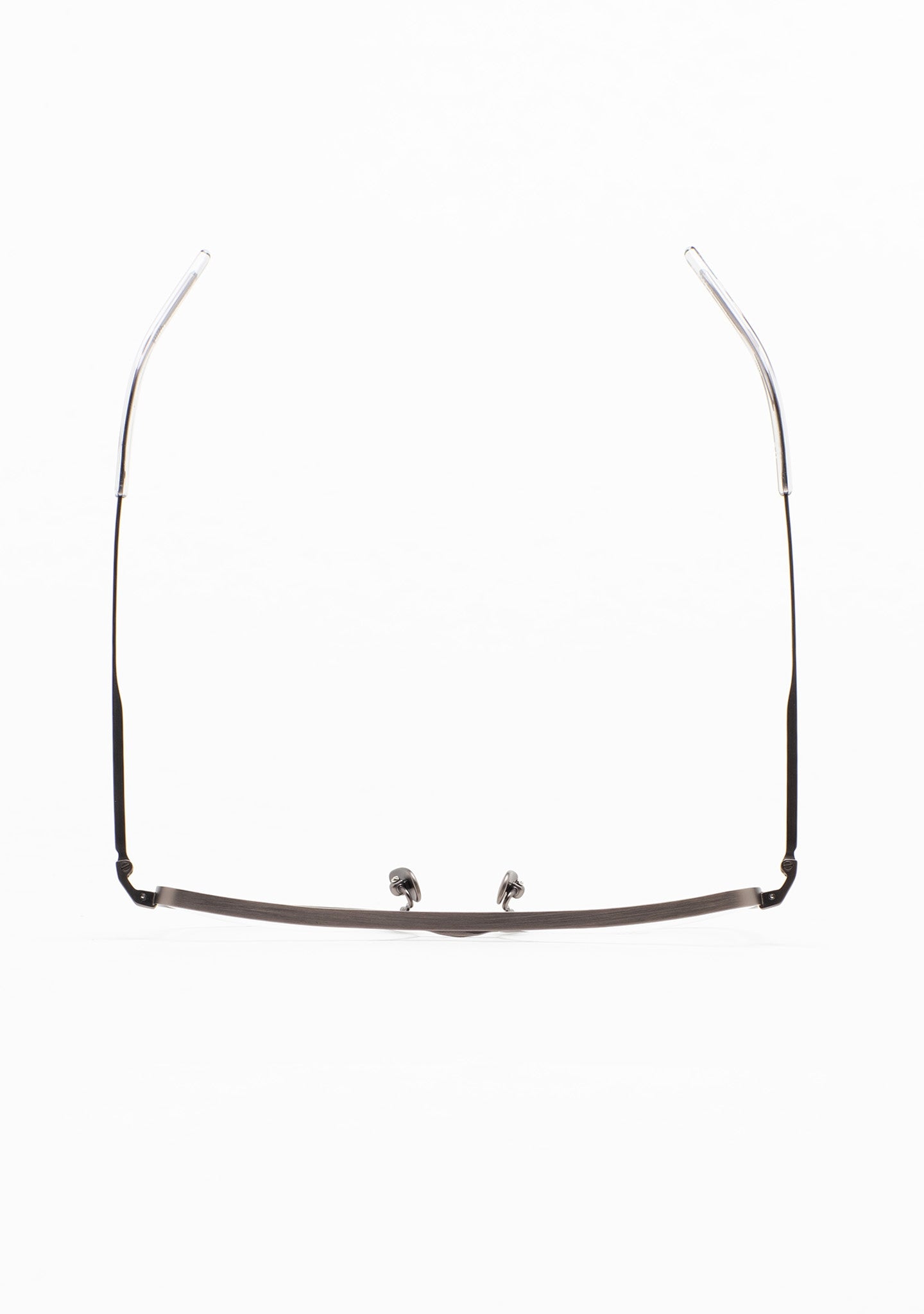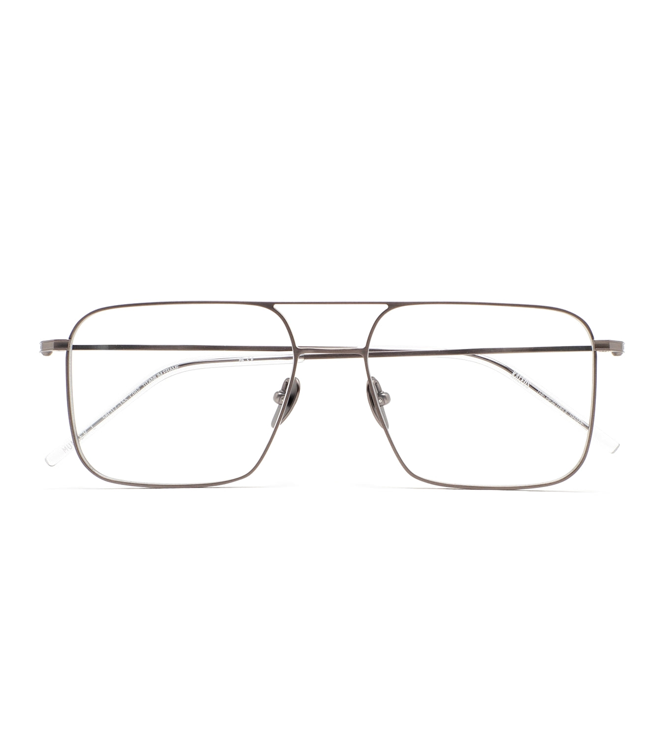 Occhiali da vista a forma rettangolare con doppio ponte. Frontale e aste in titanio grigio scuro opaco. Aste con terminale in acetato grigio trasparente. Plaquettes incorporate. Fatto a mano. Occhiali disponibili in due misure: media (M) e grande (L)..